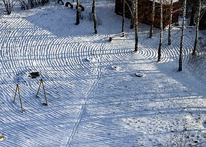 Кстати, до нашего приезда остальные жильцы этого дома не замечали этих кругов. Жизнь суетная, утром торопишься на работу, вечером домой бежишь, дома тоже дел полно. "Может быть, это мальчишки самокатом начертили круги", - предположил молодой мужчина, проживающий на первом этаже. Но его сосед-пенсионер опроверг эту версию. "У меня окна выходят во двор, и ребятишек в последние дни на детской площадке я не видел, - заверил он нас. - Их, наверное, начертили инопланетяне". Правда, у некоторых жильцов были другие версии. Кто-то говорил, что это ветер раскидал так ровно снег, кто-то решил, что на детской площадке до того, как выпасть снегу, какая-то техника проехала и взрыхлила кругами землю.