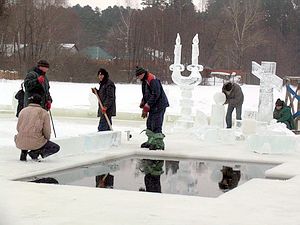 За день до начала торжеств на ледяной стройке - аврал: рабочие вырезают и достают из воды стройматериал, 10 художников и скульпторов творят, создавая из ледяных блоков огромные двухметровые свечи с застывшим пламенем, резной аналой для богослужения, символы евангелистов и четырехметровый крест. На детской площадке впервые планируют установить и обложить льдом аквариум с живыми рыбками - ротанами. После праздника их отпустят в озеро.