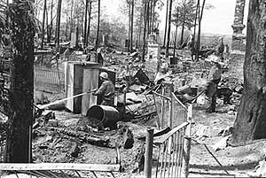 В ночь на пятницу в Зеленом Бору было светло, как днем, и слышалась канонада. Могло показаться, что "новые русские" затеяли в лесу салют и его кроваво-красные отблески освещают верхушки сосен. Утром садовое общество напоминало выжженную фашистами деревню: на территории почти в гектар дымились головешки, суетились пожарные, заливая кучи пепла, и причитали хозяйки дач, которых вызвали на место происшествия, чтобы подсчитать сумму ущерба. 52 дачи из 126 расположенных на территории садового общества "Ветеран труда" сгорели.