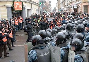 Женщина в милицейском тулупе вручает мне ярко-оранжевый "жилет сигнальный повышенной видимости". С этой спецодеждой для прессы - отдельная история. В ходе весеннего Марша несогласных ОМОН мял бока всем, кто под дубинку подвернулся, досталось и самим несогласным, и журналистам. И когда журналисты (в основном, конечно, из заграничных СМИ) закричали о беззаконии, власти сделали из этого достойный вывод. А именно: чтобы не бить вообще никого - это, конечно, утопия, но не бить специально помеченных журналистов - это можно; и тогда у СМИ не будет оснований кричать о беззаконии битья мирных граждан на городской улице.