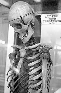 Но далеко не все экспонаты "работают" в театре по доброй воле. К примеру, один из скелетов принадлежит кровавому разбойнику Чайкину, орудовавшему в Казанской губернии. Он, говорят, одним ударом быка с ног сваливал. Двухметровый бандит сейчас мирно стоит на полусогнутых, черепом потолок подпирает.